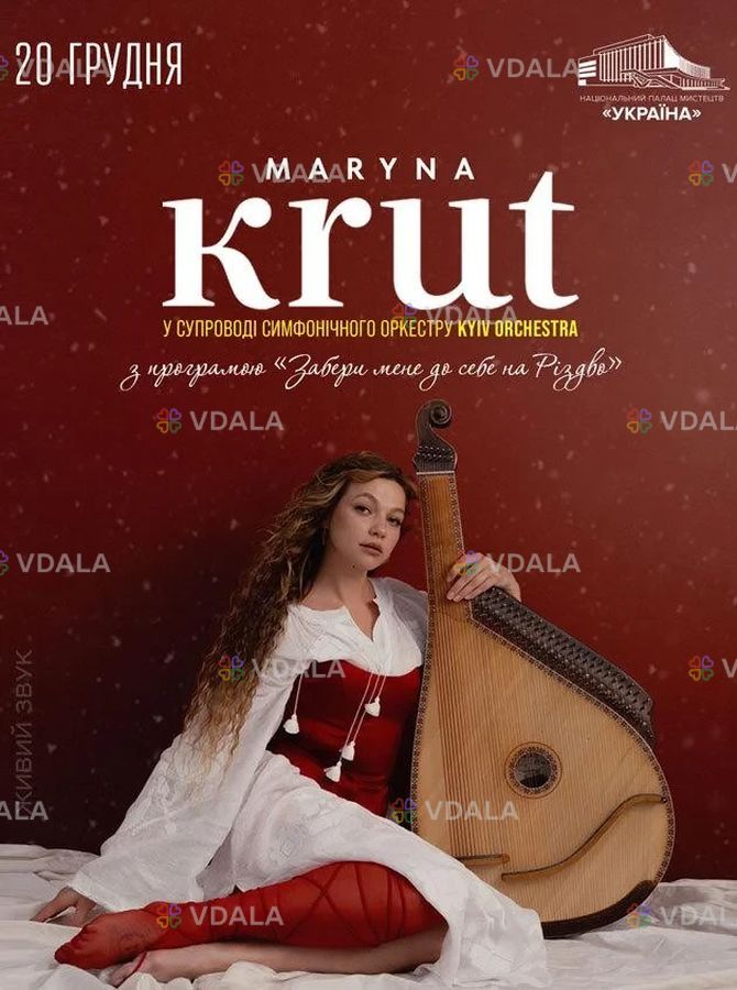 Вперше, на вас чекає неймовірна Maryna Krut у супроводі Kyiv Orchestra зі святковою програмою «Забери мене до себе на Різдво»: чарівне поєднання бандури й симфонічного оркестру, різдвяні колядки та наші улюблені пісні у новому звучанні.