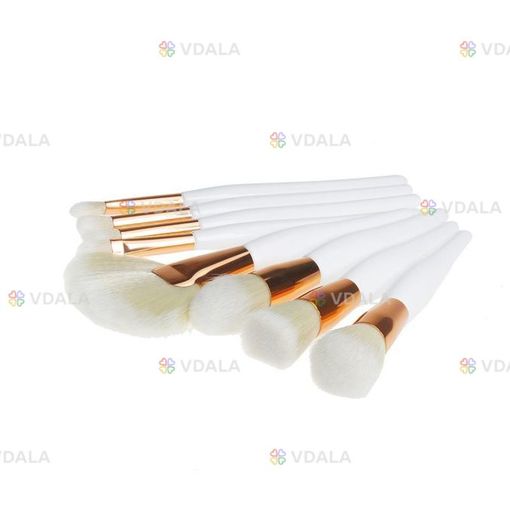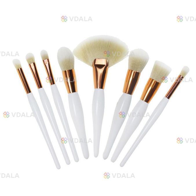 В наборе 8 кистей разного размера и формы: для нанесения пудры, тональной основы, румян, растушевывания, теней, помады, консилера, хайлайтера. То есть вы получите все необходимое для нанесения мейкапа. Кисти изготовлены из искусственных щетинок. Гипоаллергенных и долговечных. Ручки из прочного пластика, имеют эргономичную форму. Каждая в индивидуальной упаковке.