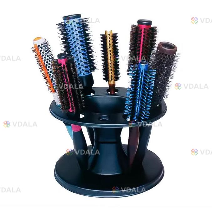 Подставка органайзер Brush Holder предназначена для правильной организации рабочего места и поддержания порядка. Аксессуар отлично подойдет как для домашнего использования, так и для профессиональных стилистов и парикмахеров. Органайзер удобно и компактно размещает все инструменты по уходу за волосами, что значительно экономит время на поиск нужного предмета. Подставка обеспечивает надежное и аккуратное хранение расчесок, а лаконичный дизайн подойдет абсолютно под любой интерьер. Аксессуар имеет 8 отверстий разного диаметра, которые отлично подойдут для хранения расчесок, ножниц, утюгов и других инструментов для волос. Также посредине подставки есть небольшое углубление, в которое с легкостью поместятся резинки, шпильки и другие аксессуары для волос.