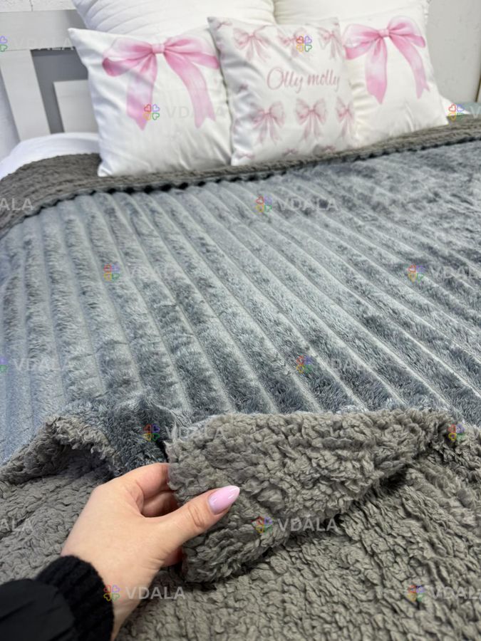Плед покрывало искусственная овчина 200×220 двусторонний очень тёплый плед полоска на диван евро размер цвет Графит