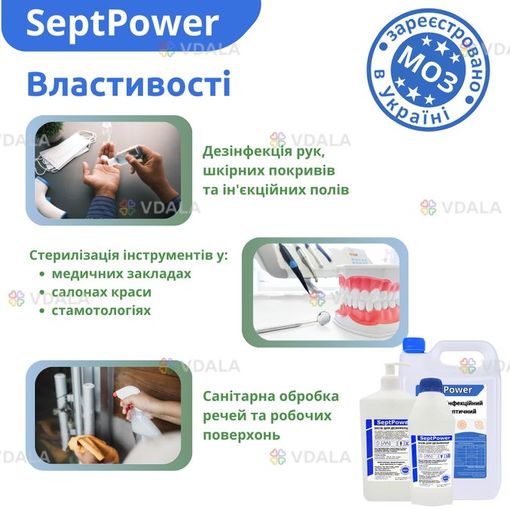 Дезинфицирующее средство "SeptPower" - это эффективное антисептическое средство, разработанное для обеспечения максимальной гигиеничности и защиты от бактерий, вирусов и микробов.
