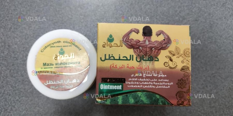 Мазь колоквинта с маслом черного тмина. Способствует уменьшению ревматологических и суставных болей, также помогает устранить мышечный спазм*