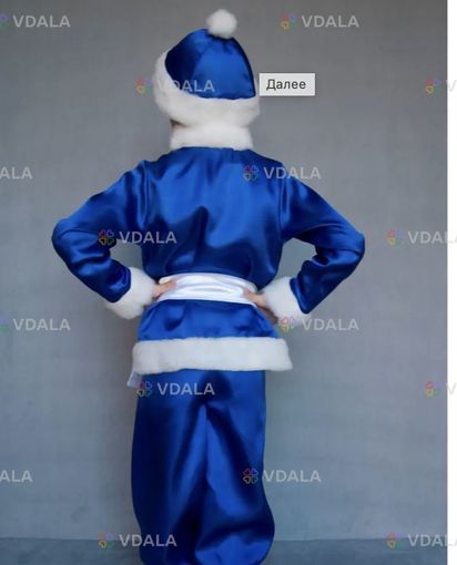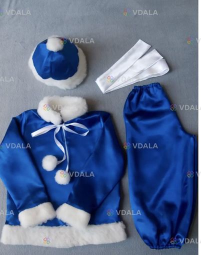 Комплектация: рубашка с воротником «стойкой» из отделочной ткани, завязки из атласной ленты дополнены бубонами из меха, манжеты рукавов и низ рубашки из отделочной ткани; штаны на резинке сверху и снизу; шапка «4-х клинка» с бубоном из меха, клинья усилены флизелином, нижний край из отделочной ткани дополнен резинкой для фиксации; пояс белого цвета.