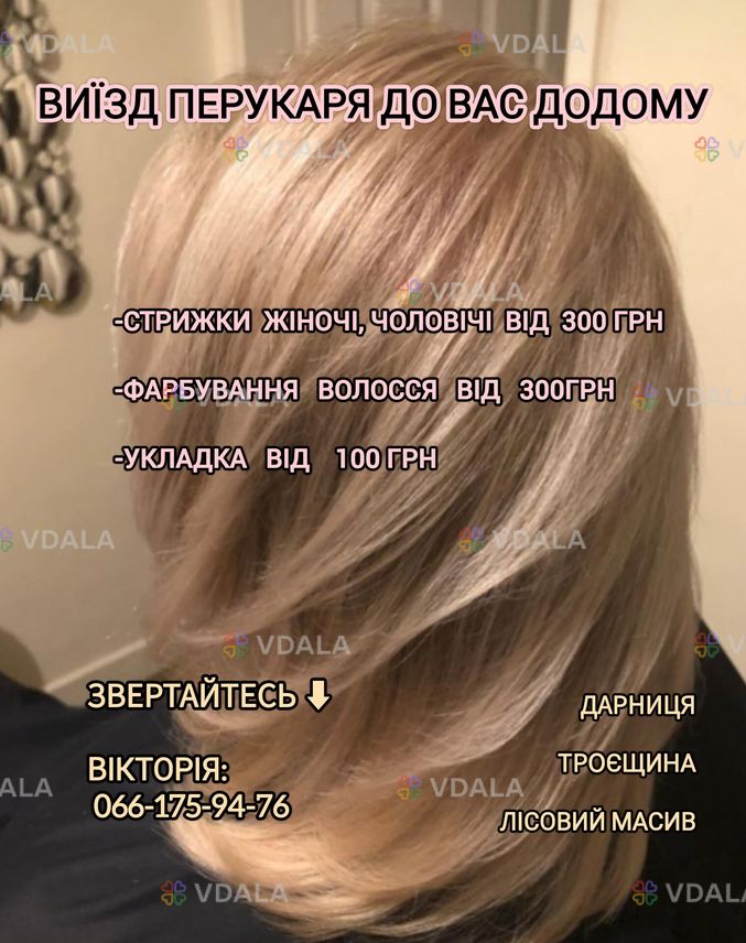 Виїзд перукаря до Вас до дому. Якісна стрижка жіноча, чоловіча, дитяча, фарбування волосся в один тон, корекція бороди, вус. Дезинфекція інструментів. Стаж 30 років Буду рада підкреслити красу Вашого волосся.