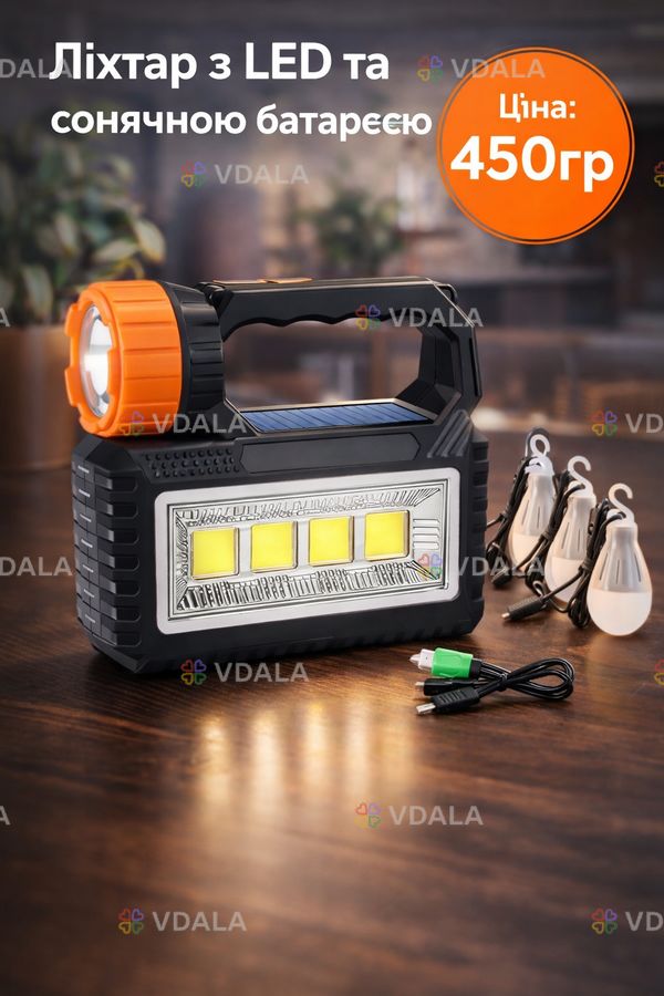 Ручний акумуляторний світлодіодний ліхтар з сонячною батареєю, функцією PowerBank та 3 лампочками OK-718S-B