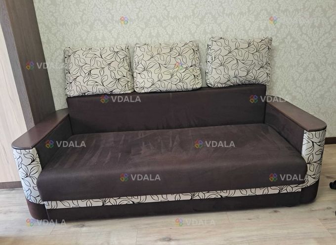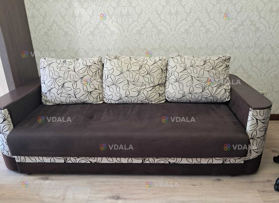 Зручний диван + 2 буфіки в подарунок. Темний колір оббивки поєднується з білим візерунком по боках, в на подушках,що надає меблям елегантного вигляду. Диван у доброму стані, готовий прикрасити ваш інтер'єр. Побішниці відкриваються, з дефектів подушки трохи зашуровані. Диван після хімчистки, спальне місце 1.90. Бажано самовивіз Івано-Фран