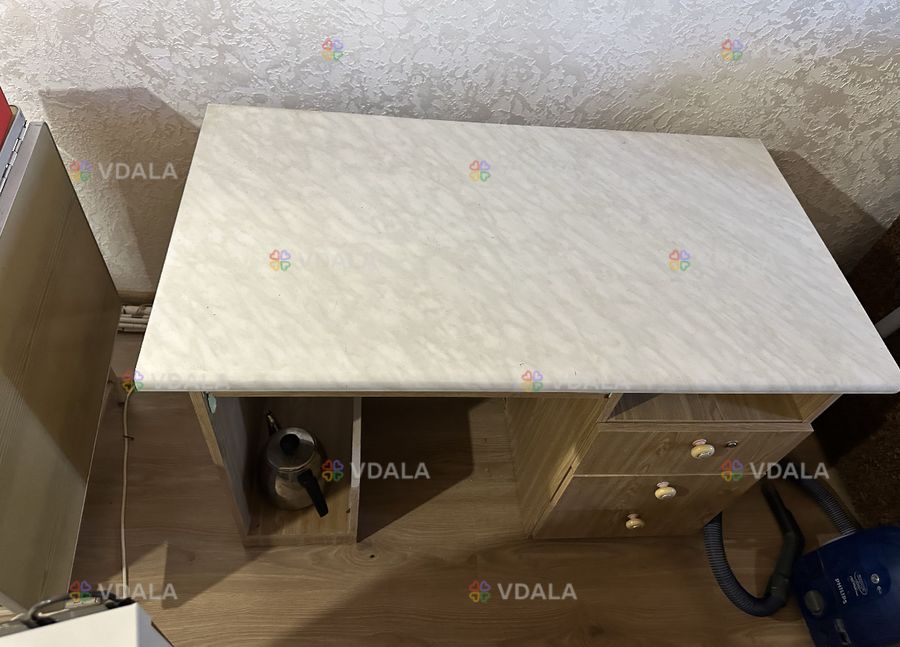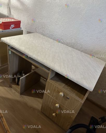 Письмовий стіл з висувними ящиками у задовільному стані, vynohradar. Стіл має білу стільницю та дерев'яний корпус з трьома висувними ящиками. Може бути корисним для роботи або навчання
