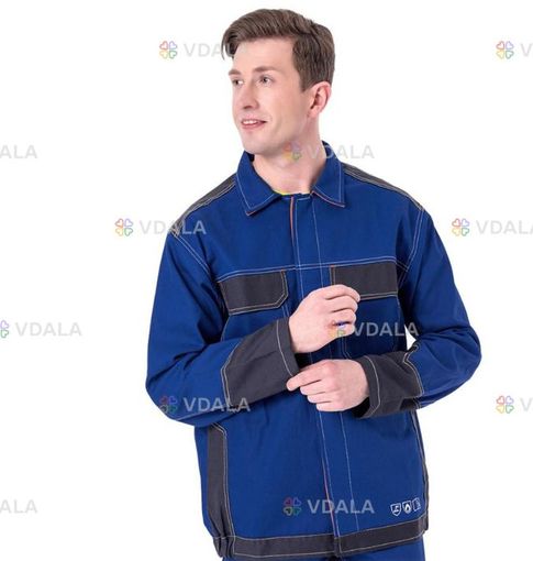 Вогнезахисна куртка для зварників. 100% бавовна, спеціальна пропитка грамматура 310 г/м² застібається на гудзики, додатково закриті складкою біля задньої частини шиї оздоблена коміром дві кишені на грудях, що застібаються на липучки знизу куртки стягує гумка, завдяки якій куртка не відстає і краще лежить по фігурі користувача чудово захищає від уламків плавленого металу, опіків під час короткочасного контакту з полум'ям, тепловим та ультрафіолетовим випромінюванням, що з'являється під час роботи з використанням електричної дуги. електростатичні властивості досліджувалися відповідно до EN 1149-2 – вертикальний опір Наприклад, ISO 11611 (A1 A2), ISO 11612 (A1 A2 B1 C1) і ISO