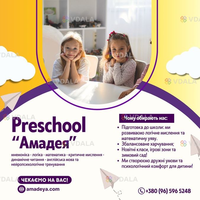 В «Амадеї» впевнені, що Preschool не є звичайним передшкільним навчанням. Це значно більше, ніж просте засвоєння алфавіту чи чисел. Preschool сприяє розвитку різних аспектів дитячої особистості, а саме: фізичних, інтелектуальних, емоційних та соціальних. І це надає Дітям можливість експериментувати, відкривати нове і розвивати свою уяву.