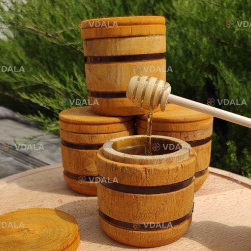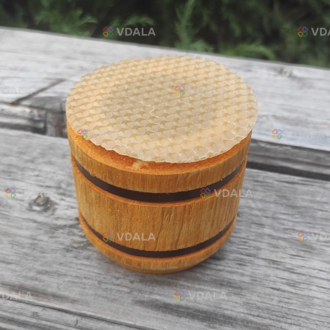 Бочонок сделан из цельного дерева, внутри покрыт тонким слоем воска, чтобы создать максимально комфортные условия для хранения мёда.