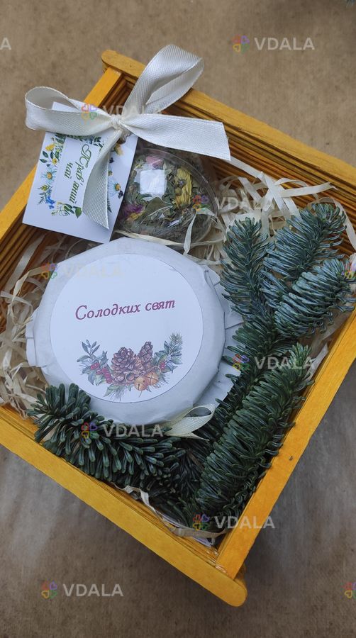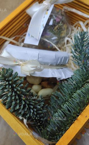 Набор дополнен веточкой живой елки Нобилис (которая долго держит иголочки), упакован в деревянной корзинке. Ее можно использовать в дальнейшем для хранения