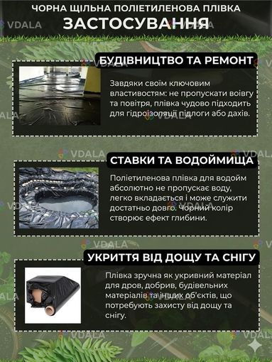 Плівка чорна будівельна – це універсальний поліетиленовий матеріал, який використовується в будівництві та ремонті для захисту, гідро- та теплоізоляції фундаментів, підлог, покрівлі та інших конструкцій, а також для захисту будівельних матеріалів від зовнішніх впливів.