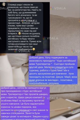 Вітаю! Мене звати Марія, я навчаюсь на 4 курсі спеціальності «Переклад» (англійська та німецька мови) та маю реальний практичний досвід використання англійської за кордоном.