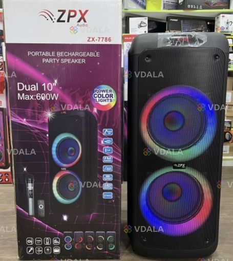 Особенностью модели является LED-подсветка с разнообразными цветовыми эффектами, которые добавляют атмосферу в процессе прослушивания музыки. ZPX ZX-7786 также поддерживает функцию TWS, которая позволяет подключать несколько колонок для создания объемного стереозвука. В комплекте идет радиомикрофон, что делает её удобной для караоке и других мероприятий с использованием микрофона.