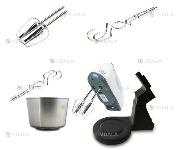 В комплекте идут венчики для взбивания и крюки для теста, что делает его универсальным помощником на кухне.