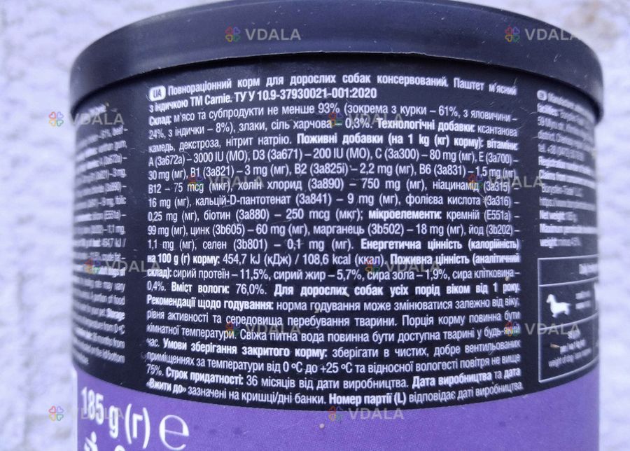 Паштет мясной (консервы) для взрослых собак фирмы Carnier. Вес банки 185г. (ф2). Годен до 03.28г. В наличии 12 банок. Продам необходимое количество. Цена указана за 1 банку.