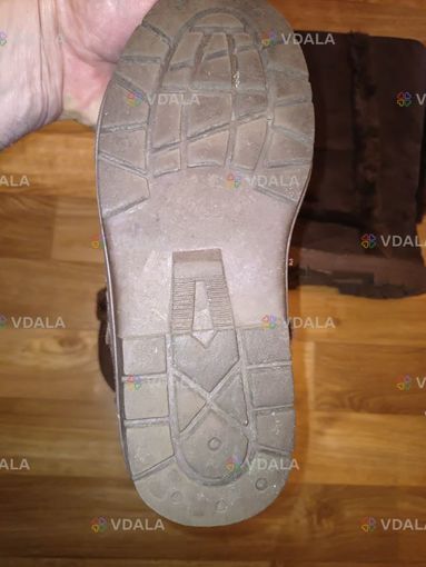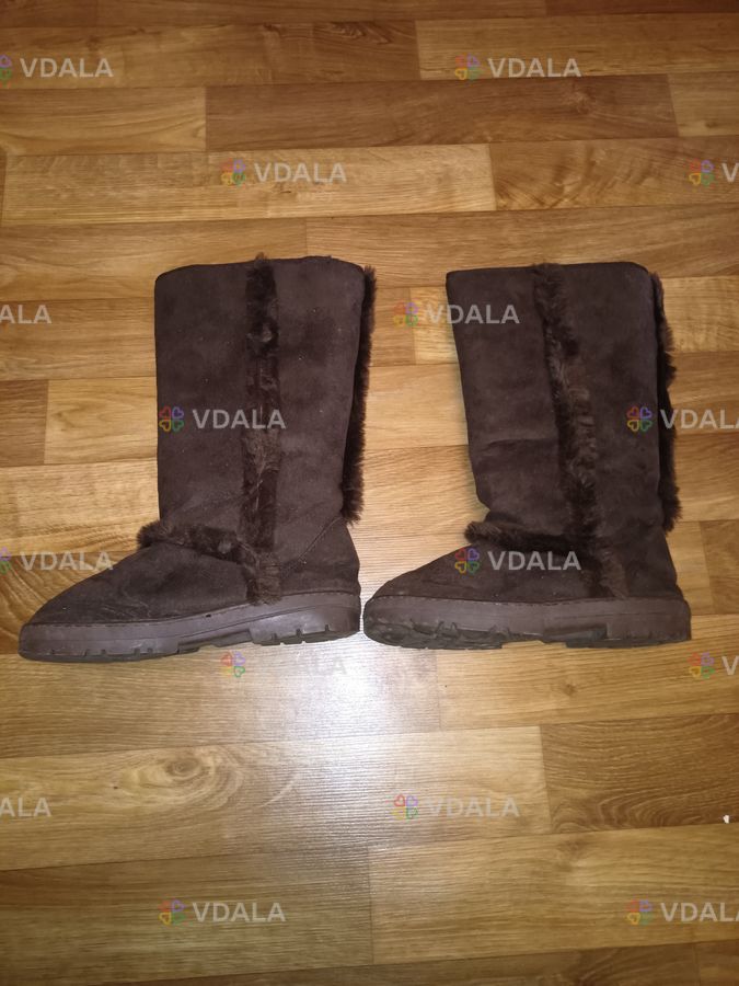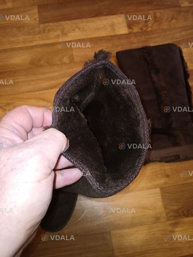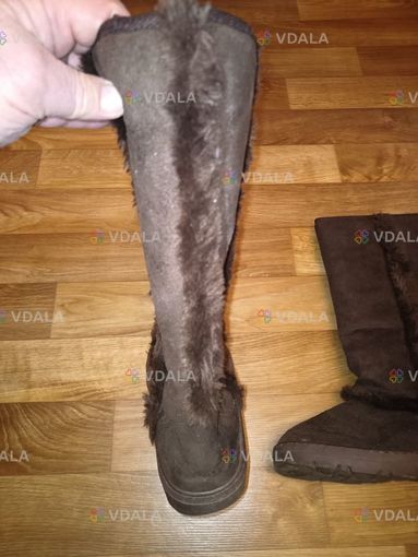 Утеплені замшеві чоботи відтінку коричневого для жінок. Ззаду та по боках прикрашені міховою стрічкою. Також внутрішня поверхня теж міхова. Дуже зручні, теплі та м'які. Поліуретанова підошва та самі сапоги майже немають ознак використання.