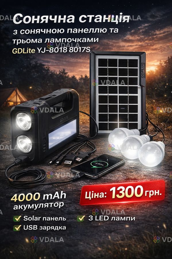Система освітлення YJ-8018 з трьома лампочками · Інвентор сонячний універсальний GD 8017 · Сонячна станція з акумулятором 4000 mAh Представляємо вам універсальну сонячну станцію GDLite GD-8017 — ідеальне рішення для тих, хто цінує автономність і зручність у будь-якому місці! Ця портативна сонячна система забезпечить вас яскравим освітленням і можливістю зарядки мобільних пристроїв навіть у найвіддаленіших куточках природи. До комплекту входять три світлодіодні лампи, які створять комфортну атмосферу на природі, в кемпінгу або у разі відключення електрики. Потужна сонячна панель на 7 Ватт безперервно заряджає вбудований акумулятор ємністю 4000 мАг, а також живить ваші гаджети через USB-порт. Сонячна станція GDLite GD-8017 проста в установці та використанні, а її надійний корпус захищає від вологи і пошкоджень, що робить її ідеальною для активного відпочинку. Незалежно від того, чи перебуваєте ви в поході, на риболовлі або просто насолоджуєтесь вечірнім відпочинком на дачі, GDLite GD-8017 забезпечить вам світло і зарядку, коли це необхідно. Оцініть комфорт автономного освітлення та зарядки з універсальною сонячною системою GDLite GD-8017! Характеристики: