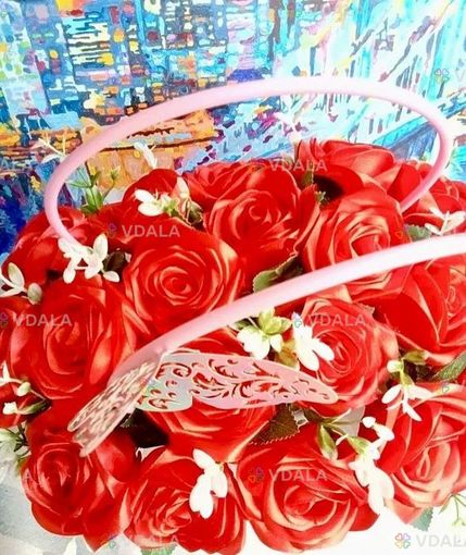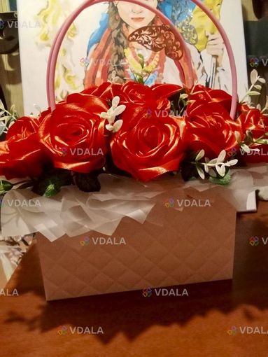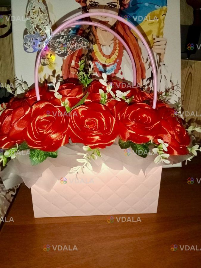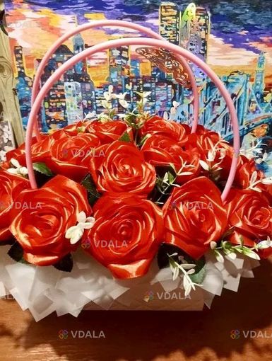 Композиція з 𝟏𝟗 троянд ручної роботи з атласної стрічки.