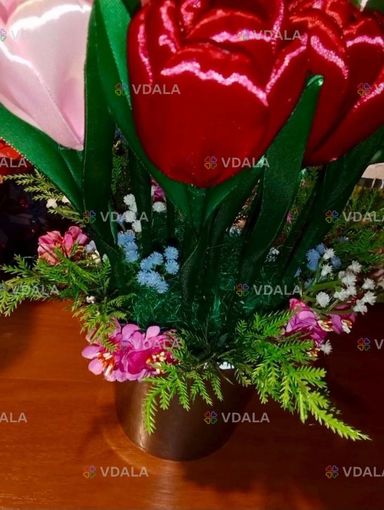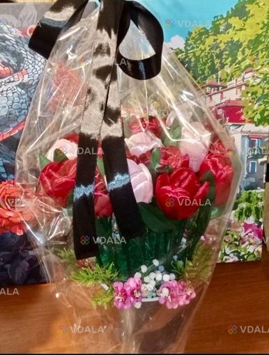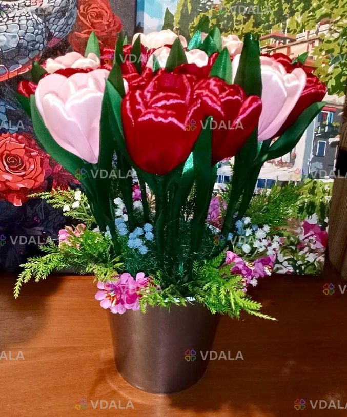 Композиція з 𝟐𝟎 тюльпанів ручної роботи з атласної стрічки у бордових та рожевих відтінках.