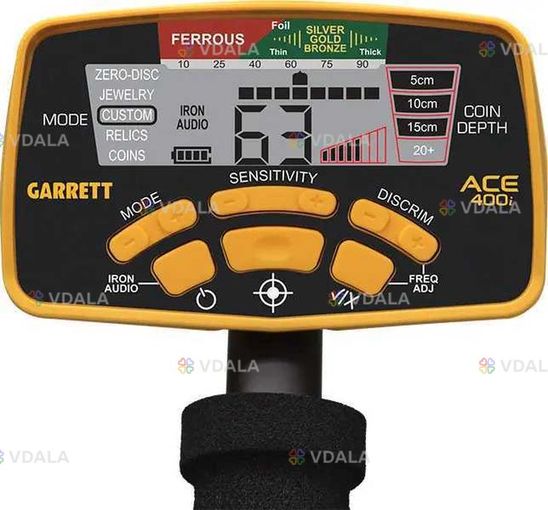 Блок управління технічно продуманий, в ньому немає елементів управління, що виступають, немає перемикачів які можна зламати. За керування приладу відповідають зручно розташовані та добре прогумовані 3 клавіші та 3 кнопки. Вони розташовані у центральній частині блоку. Таке розташування дуже зручне під час експлуатації металошукача і дає оператору можливість швидко змінювати налаштування приладу. Управління Garrett Ace 400i дуже просто та логічно продумано: