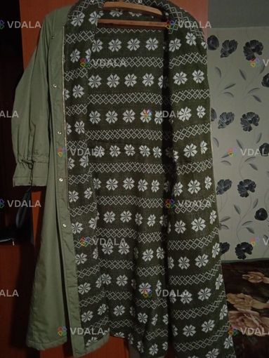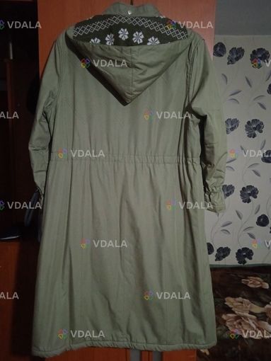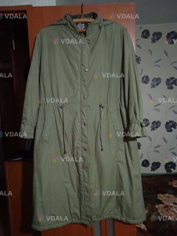 Пальто оливкового кольору, без дефектів. Розмір 52-54, довжина 112 см, рукав 58 см, капюшон відстібається