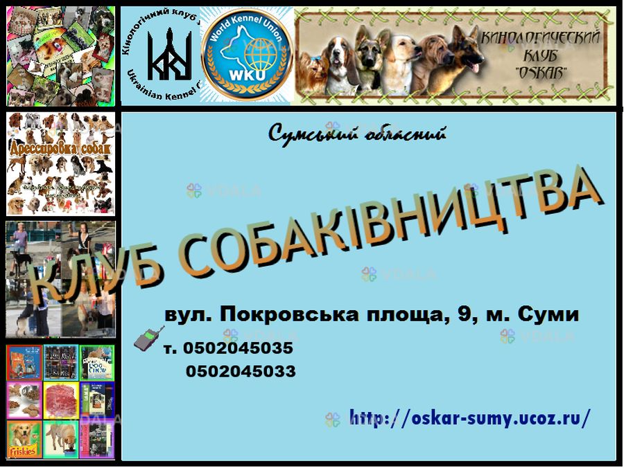 Запрошуємо усіх власників породистих собак в Сумський обласний клуб собаківництва Кінологічного Клубу України WKU - Світовий Кінологічний Союз (World Kennel Union). У клубі Ви знайдете однодумців - любителів собак, які запропонують цуценя з гарантованою порідною приналежністю, зможете оформити документи на улюбленця, родовід, проконсультуватися з питань кінології, взяти участь у виставці собак, отримати кваліфіковану допомогу у вихованні, вирощуванні, реалізації цуценят, придбанні сухих і натуральних кормів, підібрати племінний пару вихованцеві.