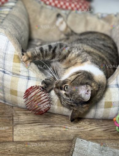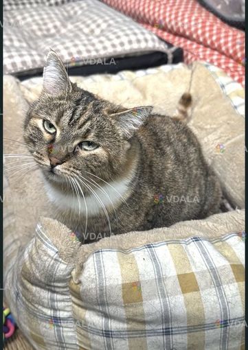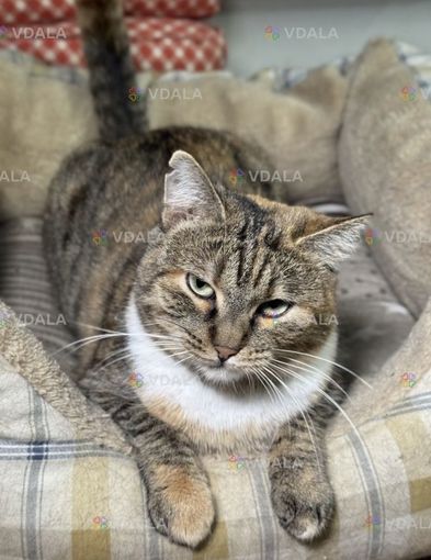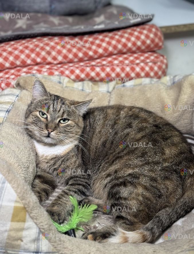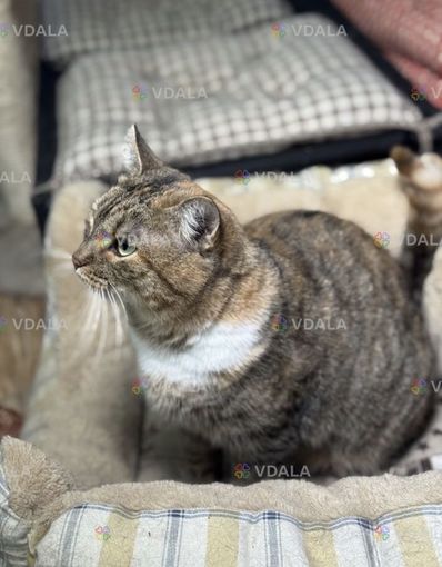 Кошка полосатая, с коричневым, с белым графиком на шейке. Возраст 2-3 года, привезена ,спасена Сумской обл. Вакцинирована, обработана, стерилизована.